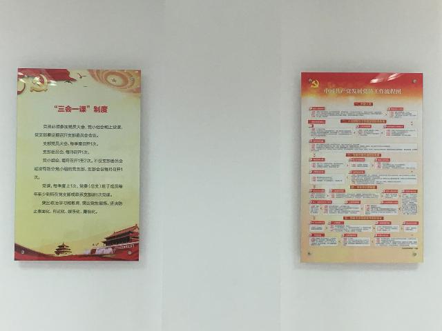 黨員活動(dòng)室在醒目位置特設(shè)主題教育墻,包括黨旗、入黨誓詞、黨員義務(wù)和權(quán)利;顒(dòng)室內(nèi)有8個(gè)宣傳展版,內(nèi)容包括組織架構(gòu)圖、黨委委員崗位職責(zé)、紀(jì)委委員崗位職責(zé)、民主生活會(huì)組織生活會(huì)制度、“三會(huì)一課”制度、民主評(píng)議黨員制度、發(fā)展黨員工作流程圖和黨員活動(dòng)日制度。活動(dòng)室還配備了報(bào)刊書(shū)架,擺放黨員學(xué)習(xí)書(shū)刊雜志等。